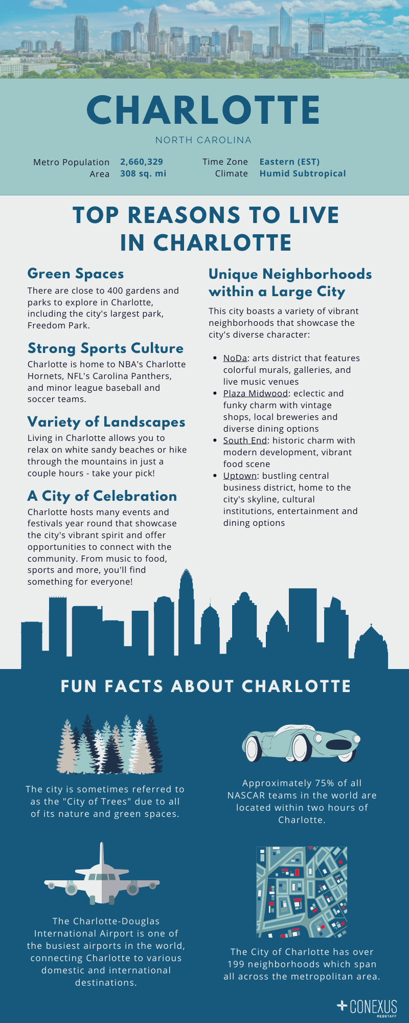 When moving to the U.S. to pursue a career, international healthcare professionals often have strong and distinct preferences of location, especially if they move with their family or on their own. A popular area of choice is Charlotte, North Carolina and its surrounding areas. This is due to its combined offering of a lively and bustling city feel paired with a quieter, more suburban environment.